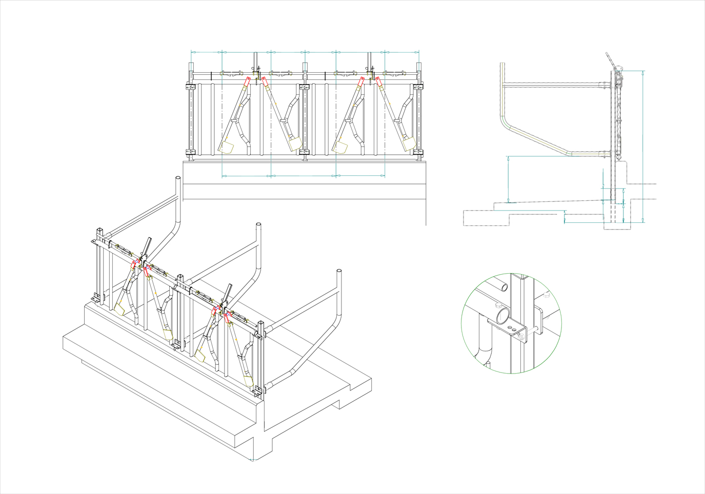 Dieses Modell kann mit gewellten Nackenrohr und zusätzlich mit einem Nylonband oder Ketten ausgestattet werden. Die Länge und Bauhöhe der Liegebügel können individuell für den Einsatzzweck gefertigt werden.