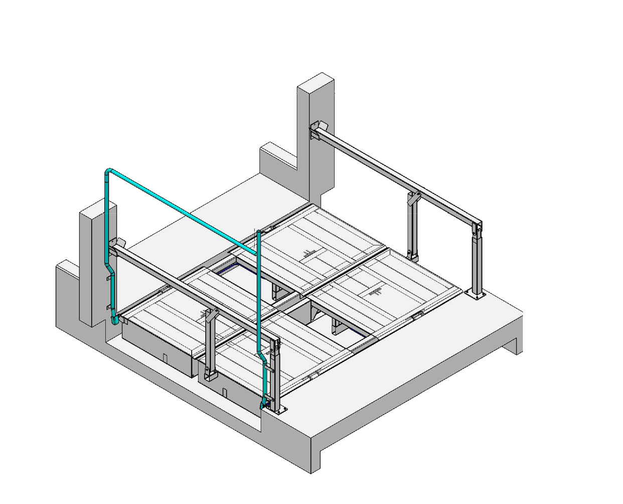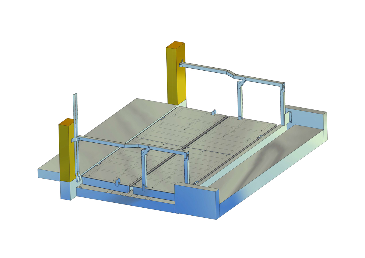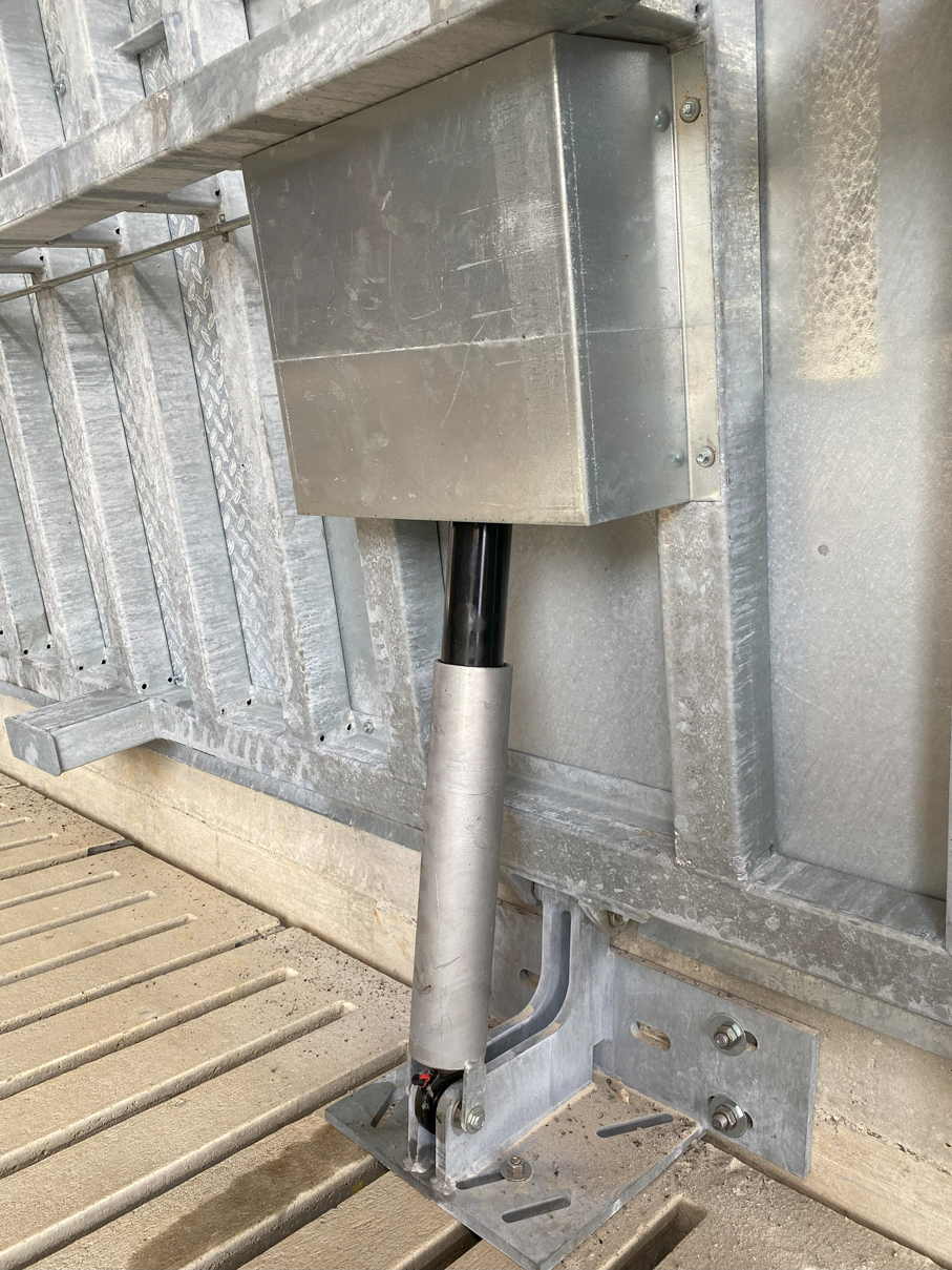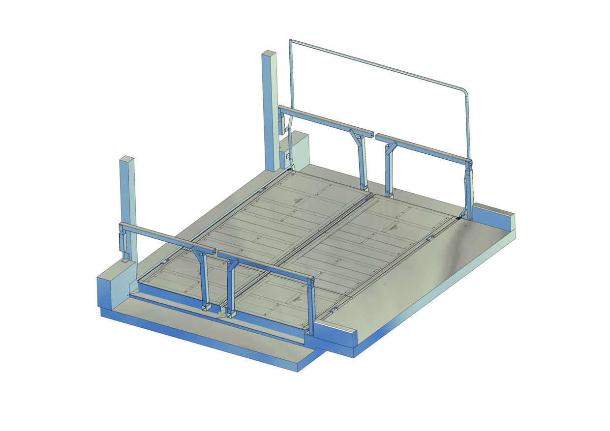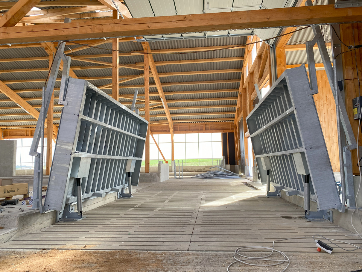 Die Brücke sorgt für einen schnelles überqueren des Futtertisches, ohne zusätzliche Absperrungen. Der Futtertisch und das Futter, wird von den Tieren nicht verunreinigt. Im geschlossenen zustand kann die Brücke überfahren werden. Die Brücke kann einteilig, zweiteilig oder bei Bedarf dreiteilig gefertigt werden. Bei der dreiteiligen Ausführung kann der zu- und rücktrieb der Tiere gleichzeitig erfolgen. Das öffnen und schließen der Plattformen erfolgt je Plattform mit zwei Hydraulik Zylinder. Robustheit und Langlebigkeit, zeichnen das hydraulische System aus. Der direkte Antrieb durch den Zylinder verringert die Verschleiß und Bruchgefahr im Vergleich zu komplexeren Systemen mit Umlenkungen. Weniger Wartung: Da hydraulische Systeme weniger bewegliche Teile haben und weniger anfällig für Verschleiß sind, erfordern sie in der Regel wenig Wartung und sind kosteneffizient in Bezug auf Instandhaltung.